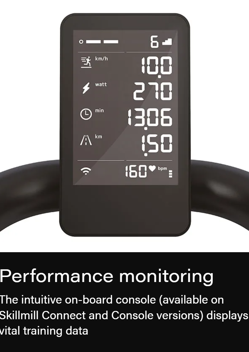Skillmill Connect combines Wi-Fi connectivity with a back-lit display, giving you access to your performance data as you train and syncing your data to the Mywellness cloud for seamless tracking.